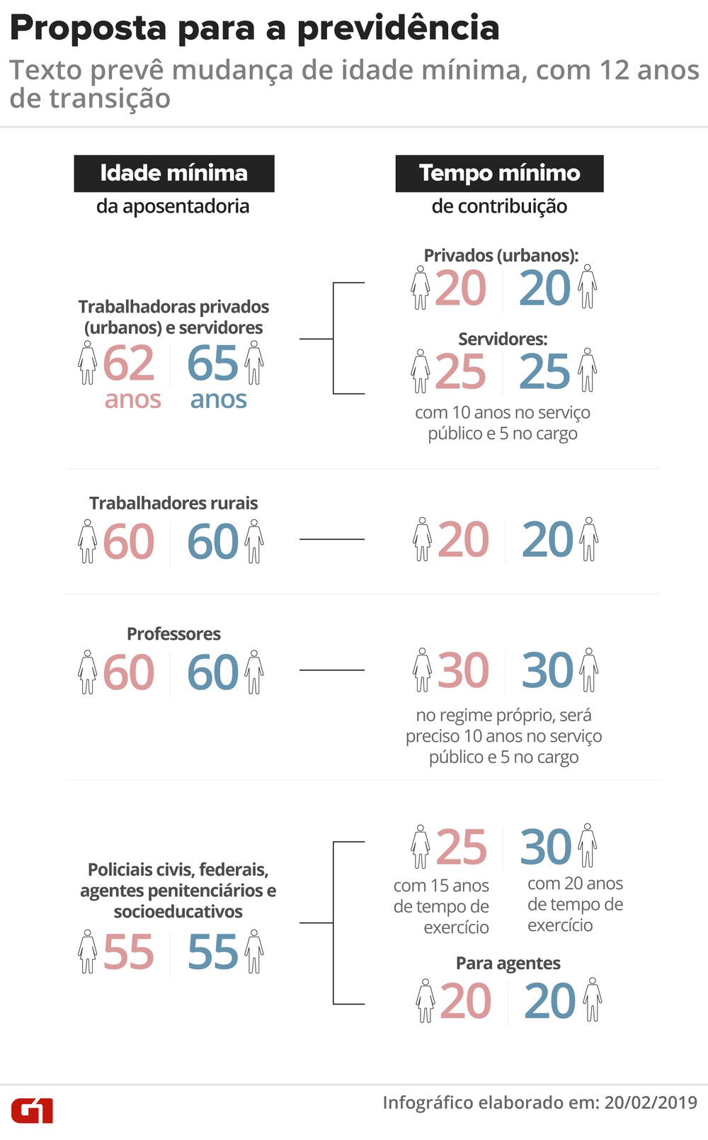 A idade mínima para se aposentar chegará a 65 anos para homens, e 62 anos para mulheres, após um período de transição. Ele vai durar 8 anos para eles e 12 anos para ela, começando em 61 anos (homens) e 56 anos (mulheres).