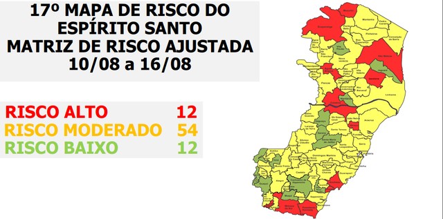 Ao todo, 12 municípios capixabas estão classificados em risco baixo, outros 54 estão em risco moderado e 12 em risco alto.
