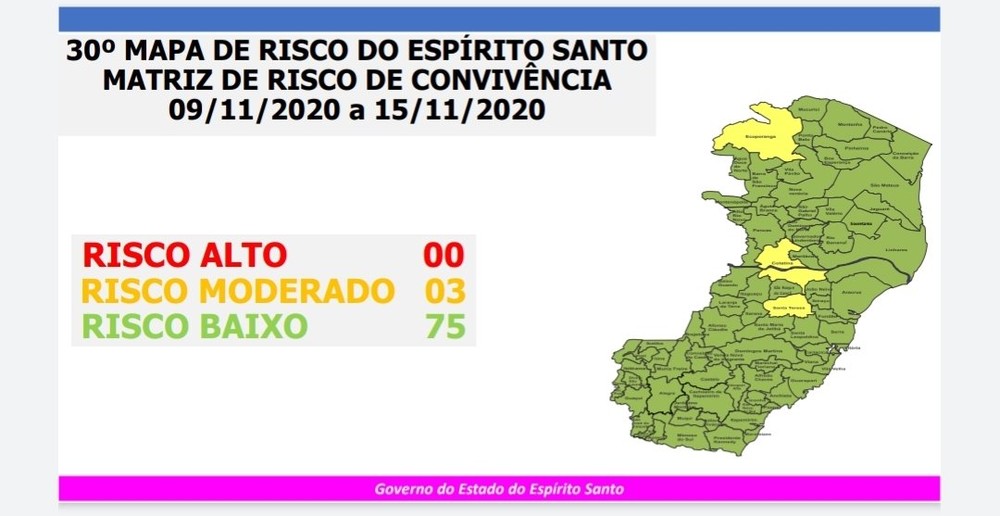 Colatina, Ecoporanga e Santa Teresa estão em risco moderado e os outros 75 municípios capixabas seguem em risco baixo.