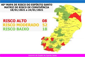 Em relação ao Mapa de Risco anterior, cuja vigência terminou neste domingo (17), o número de municípios capixabas em risco moderado diminuiu de 59 para 52. Consequentemente, aumentou-se a quantidade de cidades no risco baixo: de 11 para 18. O 40º Mapa de Risco Covid-19 terá vigência até domingo (24).