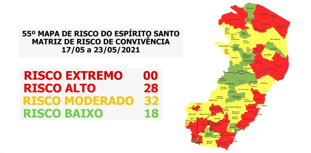 O novo mapa também tem 28 municípios em risco alto, 32 em risco moderado e 18 cidades estão em risco baixo.