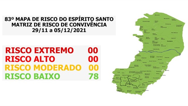 O Governo do Espírito Santo anunciou, nesta sexta-feira (26), o novo mapa de risco da Covid-19, que terá vigência desta segunda (29) até o próximo domingo (5). Todas as cidades estão classificadas em risco baixo para coronavírus.