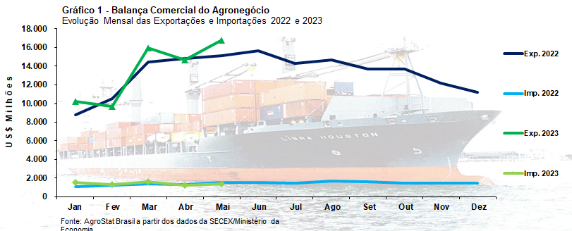 As exportações do agronegócio brasileiro alcançaram US$ 16,78 bilhões em maio: 11,2% superiores ao mesmo mês em 2022. Nunca as exportações ultrapassaram US$ 16 bilhões em um único mês, considerando-se toda a série histórica iniciada em 1997. Com o recorde, a participação do agronegócio nas exportações totais brasileiras alcançou 50,8%.