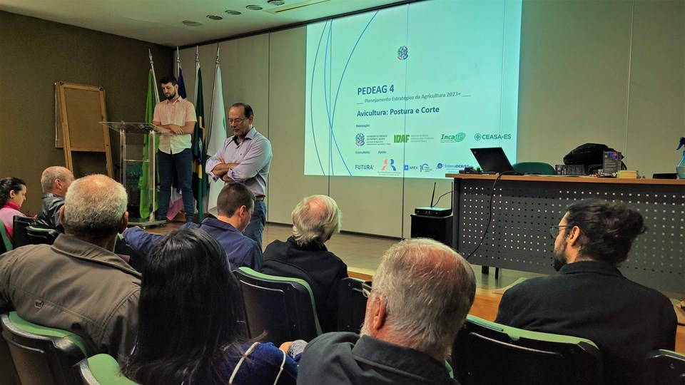 O município de Santa Maria de Jetibá recebeu, nesta sexta-feira (23), a primeira oficina presencial para a elaboração do Plano Estratégico de Desenvolvimento da Agricultura Capixaba (PEDEAG 4), que está sendo coordenado pelo Governo do Estado, por meio da Secretaria da Agricultura, Abastecimento, Aquicultura e Pesca (Seag). Maior produtor de ovos do País e com forte atuação na avicultura, o município de Santa Maria de Jetibá teve o encontro voltado para a cadeia produtiva da Avicultura de Corte e Postura. A oficina foi realizada no auditório da Nater Coop.
