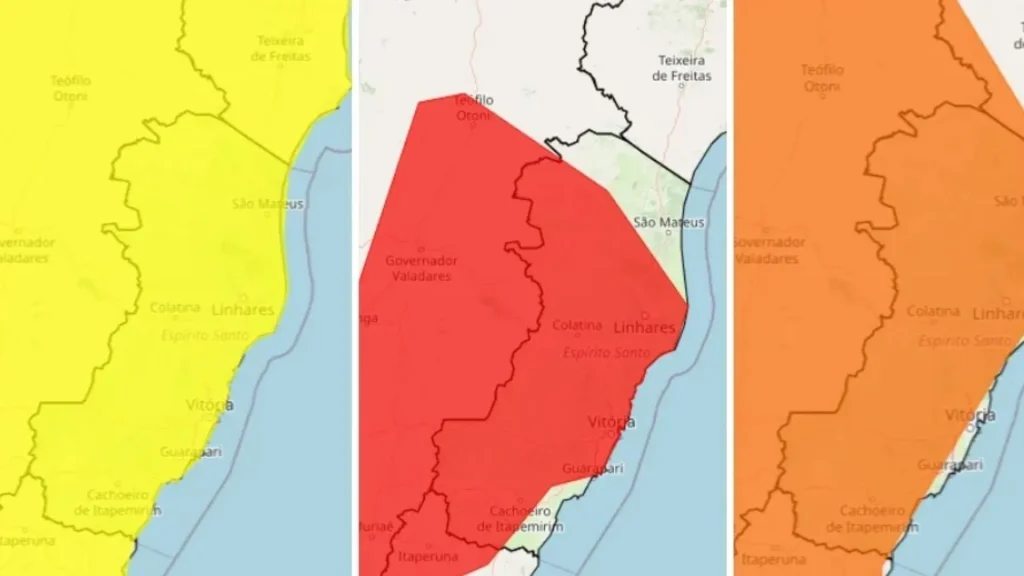 O alerta laranja, considerado o segundo nível mais elevado de risco, é válido para 77 municípios do Estado — com exceção de Pedro Canário — também até o fim desta terça-feira.